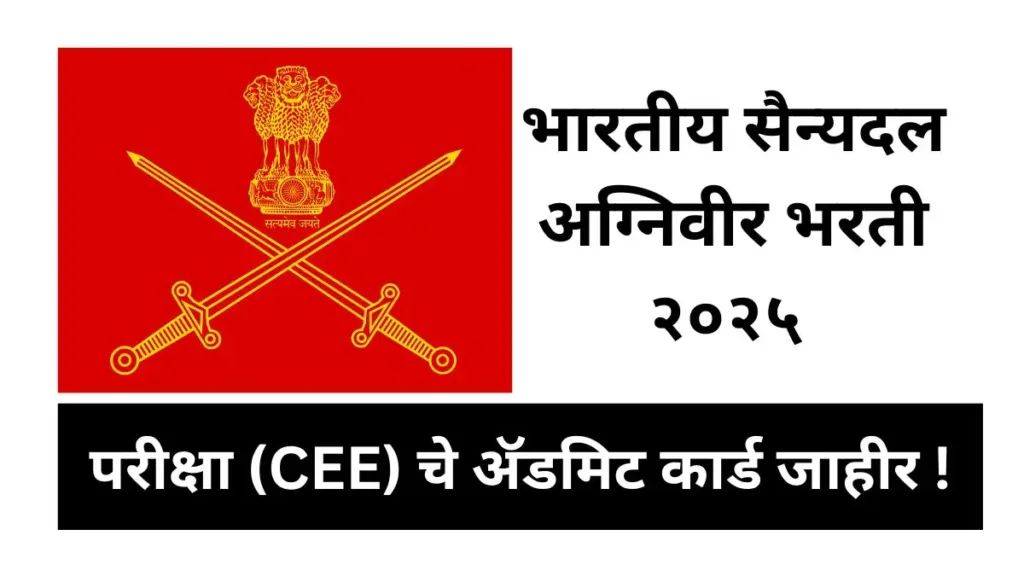 Agniveer Admit Card -भारतीय सैन्य दल (Join Indian Army) ने 2025-2026 साठी आयोजित होणाऱ्या कॉमन एन्ट्रन्स परीक्षा (CEE) साठीचे ॲडमिट कार्ड अधिकृत संकेतस्थळावर जाहीर केले आहे. ही परीक्षा 30 जून ते 10 जुलै 2025 दरम्यान देशभरातील विविध केंद्रांवर पार पडणार आहे.