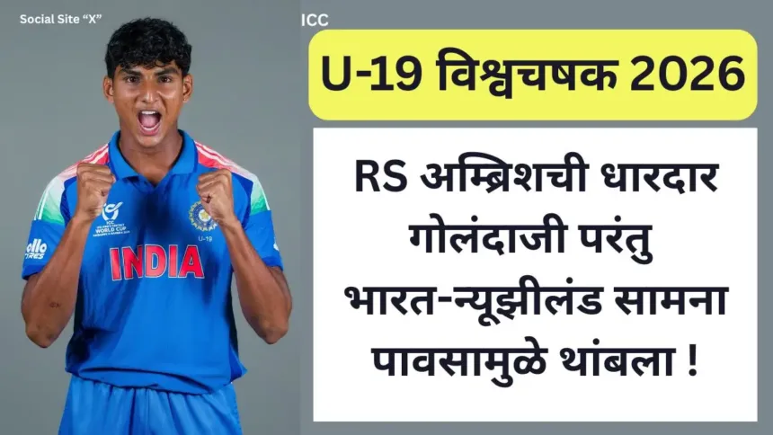 ICC अंडर-19 क्रिकेट विश्वचषक 2026 मधील ग्रुप B मधील 24वा सामना भारत अंडर-19 आणि न्यूझीलंड अंडर-19 संघांमध्ये खेळवण्यात आला. मात्र, पावसाच्या व्यत्ययामुळे सामना अपूर्ण अवस्थेत थांबवावा लागला. या सामन्यात भारतीय संघाचा वेगवान गोलंदाज RS अम्ब्रिश (Ambrish R S) याने अप्रतिम मारा करत न्यूझीलंडच्या फलंदाजीची घडी विस्कटून टाकली. याने आपल्या वेग, अचूकता आणि टप्प्याटप्प्याने वाढणाऱ्या दबावपूर्ण माऱ्याने न्यूझीलंडच्या फलंदाजीचा कणा मोडून काढला. अवघ्या काही षटकांत त्याने प्रतिस्पर्धी संघाला बॅकफूटवर ढकलत, भारतीय गोलंदाजीची ताकद आणि भविष्यातील स्टार खेळाडूची झलक क्रिकेटविश्वाला दाखवून दिली.