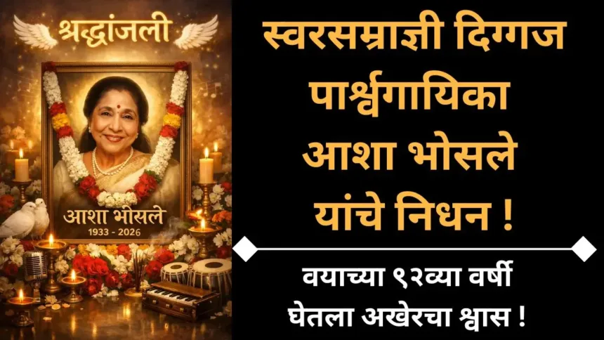 Asha Bhosle Death : भारतीय संगीतविश्वावर अमिट छाप सोडणाऱ्या दिग्गज पार्श्वगायिका Asha Bhosle यांचे आज दि. १२-०४-२०२६ रोजी मुंबईतील Breach Candy Hospital येथे निधन झाले. त्या ९२ वर्षांच्या होत्या. त्यांच्या निधनाची अधिकृत पुष्टी त्यांच्या पुत्र Anand Bhosle यांनी केली आहे. मिळालेल्या माहितीनुसार, गेल्या काही दिवसांपासून त्यांची प्रकृती खालावत होती. अतिशय थकवा (extreme exhaustion) आणि छातीत संसर्ग (chest infection) यामुळे त्यांना रुग्णालयात दाखल करण्यात आले होते. डॉक्टरांच्या देखरेखीखाली उपचार सुरू असतानाच त्यांनी अखेरचा श्वास घेतला. Asha Bhosle या भारतीय चित्रपटसृष्टीतील सर्वाधिक बहुमुखी आणि दीर्घकाळ कार्यरत राहिलेल्या गायिकांपैकी एक होत्या. हिंदीसह मराठी, बंगाली, गुजराती, पंजाबी, तमिळ, तेलुगू आदी अनेक भाषांमध्ये त्यांनी हजारो गाणी गायली. त्यांच्या कारकिर्दीचा कालावधी सात दशकांहून अधिक होता, ज्यात त्यांनी रोमँटिक, गझल, पॉप, कॅबरे, भक्तिगीते अशा विविध प्रकारांमध्ये आपला आवाज दिला. त्यांच्या बहिणी Lata Mangeshkar यांच्यासोबत त्यांनी भारतीय संगीतविश्वात सुवर्णयुग निर्माण केले. R. D. Burman यांच्यासोबतची त्यांची जोडी विशेष गाजली आणि अनेक अजरामर गाणी त्यांनी रसिकांना दिली. त्यांच्या योगदानासाठी त्यांना पद्मविभूषणसह अनेक राष्ट्रीय आणि आंतरराष्ट्रीय पुरस्कारांनी सन्मानित करण्यात आले होते. त्यांच्या निधनामुळे भारतीय संगीतविश्वात एक मोठी पोकळी निर्माण झाली असून, देशभरातून त्यांना श्रद्धांजली अर्पण केली जात आहे. संगीतप्रेमींसाठी हा अत्यंत दुःखद क्षण असून, Asha Bhosle यांचा स्वर आणि त्यांची गाणी सदैव रसिकांच्या मनात जिवंत राहतील.