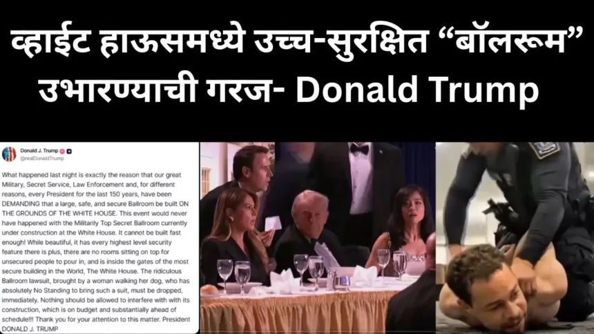 अमेरिकेचे राष्ट्राध्यक्ष Donald Trump यांनी वॉशिंग्टन डी.सी.मधील अलीकडील सुरक्षा घटनेनंतर महत्त्वपूर्ण विधान करत व्हाईट हाऊसमध्ये उच्च-सुरक्षित (Ballroom) “बॉलरूम” (सभागृह) उभारण्याची गरज पुन्हा अधोरेखित केली आहे. ही प्रतिक्रिया त्यांनी त्यांच्या सोशल मीडिया प्लॅटफॉर्म Truth Social वर पोस्टद्वारे व्यक्त केली असून, अमेरिकेतील सुरक्षाव्यवस्थेबाबत नवी चर्चा सुरू झाली आहे. अलीकडील सुरक्षा घटनेनंतर ट्रम्प यांची ठाम भूमिका – White House Correspondents’ Dinner दरम्यान झालेल्या सुरक्षा गोंधळाच्या पार्श्वभूमीवर ट्रम्प यांनी स्पष्टपणे म्हटले की, “अशा घटना टाळण्यासाठी गेल्या 150 वर्षांपासून राष्ट्राध्यक्ष, लष्कर आणि सुरक्षा यंत्रणा व्हाईट हाऊसच्या परिसरात सुरक्षित बॉलरूम बांधण्याची मागणी करत आहेत.” त्यांच्या मते, सध्या बांधकाम सुरू असलेले हे अत्याधुनिक सभागृह पूर्ण झाले असते, तर ही घटना घडलीच नसती.