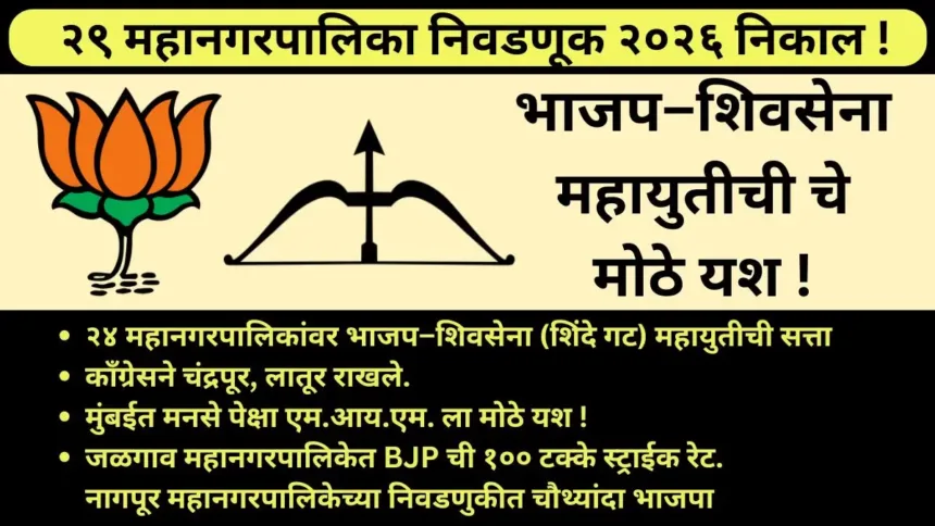 राज्यातील २९ महानगरपालिकांच्या निवडणूक निकालात (BJP) भाजप–शिवसेना (शिंदे गट) महायुतीने अभूतपूर्व यश संपादन करत तब्बल २४ महानगरपालिकांवर सत्ता प्रस्थापित केली आहे. या महायुतीने बृहन्मुंबई, ठाणे, नवी मुंबई, कल्याण–डोंबिवली, उल्हासनगर, पनवेल, मीरा–भाईंदर, नाशिक, धुळे, जळगाव, पुणे, पिंपरी–चिंचवड, सांगली–मिरज–कुपवाड, सोलापूर, छत्रपती संभाजीनगर, नांदेड–वाघाळा, अकोला, नागपूर, जालना, ईचलकरंजी, अमरावती, अहिल्यानगर, भिवंडी–निजामपूर आणि चंद्रपूर या महानगरपालिकांमध्ये स्पष्ट बहुमत मिळवत सत्ता काबीज केली. विशेष म्हणजे मुंबई महानगरपालिकेपासून पुणे, नागपूर आणि ठाण्यासारख्या आर्थिक व राजकीयदृष्ट्या महत्त्वाच्या शहरांपर्यंत महायुतीचे वर्चस्व प्रस्थापित झाले आहे. या निकालातून मुख्यमंत्री देवेंद्र फडणवीस यांच्या नेतृत्वाला मिळालेली जनमान्यता आणि भाजपची शहरी भागातील संघटनात्मक ताकद पुन्हा एकदा अधोरेखित झाली असून, महाराष्ट्राच्या नागरी राजकारणात महायुती युगाची ठाम मुहूर्तमेढ रोवली गेल्याचे स्पष्ट चित्र समोर आले आहे.
