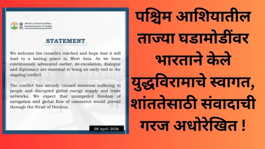 नवी दिल्ली, ८ एप्रिल २०२६ – पश्चिम आशियात सुरू असलेल्या तणावपूर्ण परिस्थितीच्या पार्श्वभूमीवर भारताने महत्त्वपूर्ण भूमिका मांडत अलीकडेच जाहीर झालेल्या (Ceasefire) युद्धविरामाचे स्वागत केले आहे. भारत सरकारने स्पष्ट केले की, हा युद्धविराम दीर्घकालीन शांततेकडे नेणारा ठरेल, अशी अपेक्षा आहे. यासोबतच भारताने पुन्हा एकदा ठामपणे सांगितले की, संघर्ष संपवण्यासाठी तणाव कमी करणे (De-escalation), संवाद (Dialogue) आणि राजनैतिक प्रयत्न (Diplomacy) हेच एकमेव प्रभावी मार्ग आहेत.