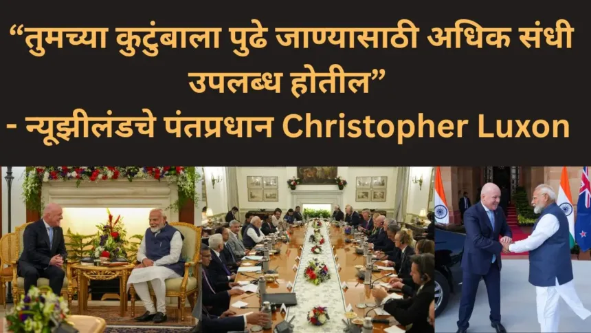 न्यूझीलंडचे पंतप्रधान Christopher Luxon यांनी भारतासोबत झालेल्या ऐतिहासिक मुक्त व्यापार कराराबाबत (Free Trade Agreement – FTA) महत्त्वपूर्ण घोषणा केली आहे. त्यांनी सोशल मीडियावर दिलेल्या माहितीनुसार, जवळपास एक वर्षापूर्वी भारताचे पंतप्रधान Narendra Modi यांच्यासोबत झालेल्या बैठकीत या करारासाठी चर्चा सुरू करण्याचा निर्णय घेण्यात आला होता. अनेक दशकांपासून अशा कराराची शक्यता कमी असल्याचे मानले जात होते, मात्र अखेर हा करार साकार झाला आहे. ऐतिहासिक कराराची घोषणा – क्रिस्टोफर लक्सन यांनी सांगितले की, हा करार “पिढीतून एकदाच होणारा” (once-in-a-generation) असा ऐतिहासिक टप्पा आहे. या करारामुळे न्यूझीलंडच्या निर्यातदारांना भारतासारख्या १.४ अब्ज लोकसंख्या असलेल्या मोठ्या बाजारपेठेत अभूतपूर्व प्रवेश मिळणार आहे. भारताची अर्थव्यवस्था आगामी काळात जगातील तिसऱ्या क्रमांकाची सर्वात मोठी अर्थव्यवस्था बनण्याच्या दिशेने वाटचाल करत असल्यामुळे, हा करार न्यूझीलंडसाठी अत्यंत फायदेशीर मानला जात आहे.