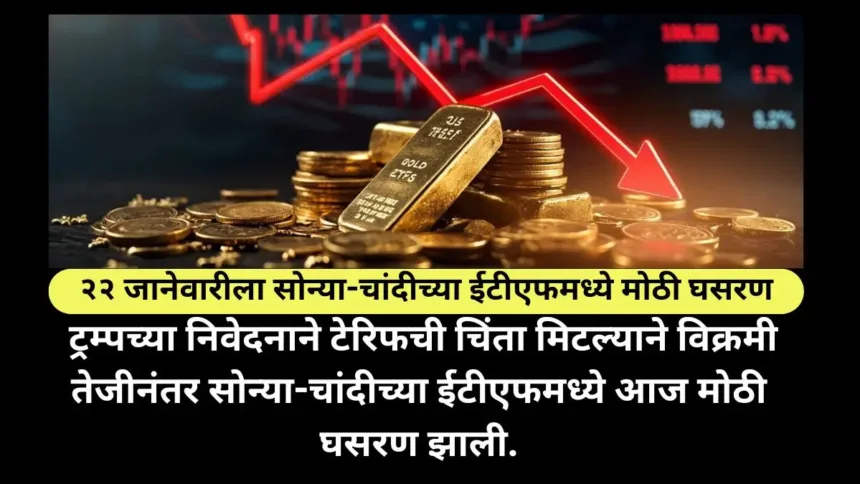 पूर्वीच्या रेकॉर्ड ब्रेक तेजीच्या पार्श्वभूमीवर आज ईटीएफमध्ये १२ ते २४ टक्के घसरण नोंदली गेली आहे. घसरणीचे मुख्य कारण म्हणजे दावोस येथील बैठकीनंतर अमेरिकेचे राष्ट्राध्यक्ष डोनाल्ड ट्रम्प यांनी नेटोशी ग्रीनलंडच्या भविष्याबाबत कराराची रूपरेषा जाहीर केली. यामुळे फेब्रुवारी महिन्यात नियोजित टेरिफ रद्द झाल्याने भू-राजकीय जोखमीतील तणाव कमी झाला, ज्याचा परिणाम किंमतींवर दिसून आला.