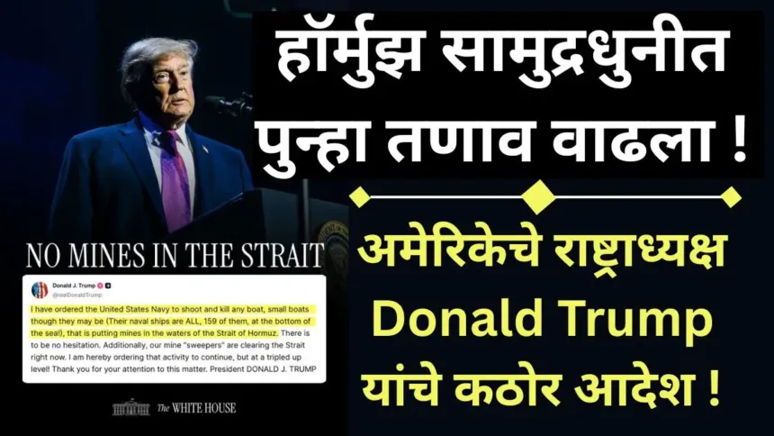 मध्यपूर्वेतील महत्त्वाच्या समुद्री मार्गांपैकी एक असलेल्या हॉर्मुझ (Hormuz) सामुद्रधुनीबाबत अमेरिकेचे राष्ट्राध्यक्ष Donald Trump यांनी अतिशय आक्रमक भूमिका घेतल्याने आंतरराष्ट्रीय स्तरावर तणाव वाढण्याची शक्यता निर्माण झाली आहे. त्यांनी दिलेल्या निवेदनात अमेरिकन नौदलाला स्पष्ट आदेश देताना सांगितले की, हॉर्मुझ सामुद्रधुनीत माइन (स्फोटक उपकरणे) टाकण्याचा प्रयत्न करणाऱ्या कोणत्याही छोट्या बोटीवर त्वरित गोळीबार करून ती नष्ट करण्यात यावी. ट्रम्प यांनी आपल्या विधानात म्हटले की, “मी अमेरिकेच्या नौदलाला आदेश दिले आहेत की, हॉर्मुझ सामुद्रधुनीच्या पाण्यात माइन टाकणाऱ्या कोणत्याही बोटीवर कोणतीही दिरंगाई न करता कारवाई करावी.” त्यांनी यावेळी शत्रूच्या नौदल जहाजांबाबतही कठोर भाष्य करत दावा केला की, त्यांच्या सर्व १५९ जहाजांचा नाश करण्यात आला आहे.