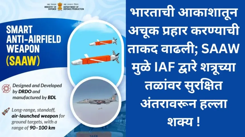 भारताच्या संरक्षण क्षमतेत मोठी भर पडली असून, आकाशातून अचूक प्रहार करण्याची क्षमता अधिक मजबूत झाली आहे. Defence Production India ने दिलेल्या माहितीनुसार, Smart Anti-Airfield Weapon (SAAW) या स्वदेशी शस्त्रामुळे भारतीय वायुदलाला (IAF) शत्रूच्या महत्त्वाच्या तळांवर सुरक्षित अंतरावरून अचूक हल्ले करणे शक्य होणार आहे. ही अत्याधुनिक शस्त्र प्रणाली Defence Research and Development Organisation (DRDO) द्वारे पूर्णपणे स्वदेशी तंत्रज्ञानाने विकसित करण्यात आली असून तिचे उत्पादन Bharat Dynamics Limited (BDL) कडून केले जात आहे. ‘मेक इन इंडिया’ उपक्रमांतर्गत विकसित झालेली ही प्रणाली भारताच्या संरक्षण स्वावलंबनाचे महत्त्वाचे उदाहरण मानली जाते. अचूकता आणि सुरक्षितता – SAAW ची खासियत – SAAW हे एक प्रिसिजन-गाईडेड शस्त्र असून, विशेषतः शत्रूच्या हवाई तळांवर, रनवे, रडार आणि इतर महत्त्वाच्या पायाभूत सुविधांवर हल्ला करण्यासाठी तयार करण्यात आले आहे. या शस्त्राची सर्वात मोठी ताकद म्हणजे त्याची 90 ते 100 किमी पर्यंतची स्ट्राइक रेंज, ज्यामुळे भारतीय विमानांना शत्रूच्या हवाई संरक्षण व्यवस्थेच्या बाहेर राहून लक्ष्य भेदता येते. यामुळे भारतीय वायुदलाला शत्रूच्या प्रदेशात खोलवर प्रवेश न करता, सुरक्षित अंतरावरून हल्ला करण्याची क्षमता मिळते. विशेषतः ज्या भागांमध्ये अत्याधुनिक एअर डिफेन्स सिस्टीम असते, तिथे ही प्रणाली अत्यंत प्रभावी ठरते.