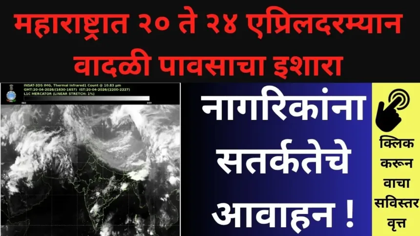 मुंबई, दि. २० एप्रिल — महाराष्ट्र DGIPR यांनी दिलेल्या माहितीनुसार, भारतीय हवामान विभाग (IMD Wheather) च्या २० एप्रिल २०२६ रोजी जारी केलेल्या पाच दिवसांच्या हवामान अंदाजात राज्यातील विविध भागांमध्ये वादळी वारे, विजांचा कडकडाट, गारपीट आणि पावसाची शक्यता वर्तविण्यात आली आहे. हा इशारा २० ते २४ एप्रिल या कालावधीसाठी लागू असून, विशेषतः मध्य महाराष्ट्र, विदर्भ, मराठवाडा आणि कोकण या विभागांतील जिल्ह्यांनी सतर्क राहण्याचे आवाहन राज्य आपत्कालीन संचालन केंद्राकडून करण्यात आले आहे. हवामानाचा बदलता अंदाज – IMD च्या अंदाजानुसार, या कालावधीत वातावरणात अस्थिरता वाढण्याची शक्यता आहे. उष्णतेच्या पार्श्वभूमीवर निर्माण होणारे ढग, स्थानिक वाऱ्यांची दिशा आणि आर्द्रतेतील वाढ यामुळे वादळी पावसाचे स्वरूप तीव्र होऊ शकते. काही ठिकाणी विजांच्या कडकडाटासह गारपीट होण्याचीही शक्यता असल्याने शेती, वाहतूक आणि दैनंदिन जीवनावर परिणाम होण्याची शक्यता व्यक्त करण्यात येत आहे.