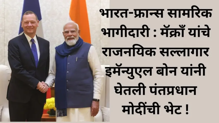 फ्रान्सचे राष्ट्राध्यक्ष इमॅन्युएल मॅक्रॉं यांचे राजनयिक सल्लागार इमॅन्युएल बोन यांनी प्रधानमंत्री नरेंद्र मोदी यांची भेट घेतली. या भेटीत भारत-फ्रान्स (India France) यांच्यातील सामरिक भागीदारीची पुष्टी करताना दोन्ही देशांच्या जवळीकेचे कौतुक केले गेले. ही भेट १३ जानेवारी २०२६ रोजी घडली असून, ती ३८व्या भारत-फ्रान्स सामरिक संवादाचा भाग होती. भारत आणि फ्रान्स यांच्यातील सामरिक भागीदारीत संरक्षण, तंत्रज्ञान आणि इनोव्हेशन क्षेत्रांत अनेक येणारे करार आणि करारनामे ठरले आहेत. हे करार आत्मनिर्भर भारत आणि मेक इन इंडियाला चालना देणारे आहेत. फेब्रुवारी २०२६ मध्ये राष्ट्राध्यक्ष इमॅन्युएल मॅक्रॉं यांच्या भारत दौऱ्यात अनेक मुद्द्यांवर अंतिम मोहर लागणार आहे त्या दृष्टीने इमॅन्युएल बोन यांची भेट महत्वपूर्ण मानली जात आहे.