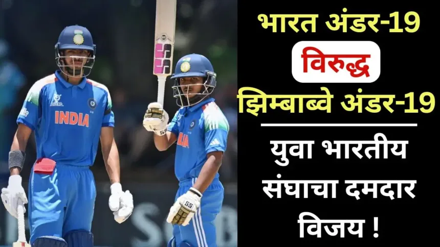 India U-19 Vs Zimbabwe U-19 – भारत अंडर-19 आणि झिम्बाब्वे अंडर-19 संघांमधील सामना अत्यंत उत्साहात पार पडला. युवा खेळाडूंच्या कौशल्याचे दर्शन घडवणाऱ्या या सामन्यात भारतीय संघाने सर्वच विभागात उत्कृष्ट कामगिरी करत झिम्बाब्वे अंडर-19 संघावर वर्चस्व गाजवले. या मालिकेतील सामना दोन्ही संघांसाठी अनुभव मिळवण्याच्या दृष्टीने महत्त्वाचा ठरला. भारतीय संघाने फलंदाजी, गोलंदाजी आणि क्षेत्ररक्षण या तिन्ही विभागांत संतुलित खेळ सादर केला.