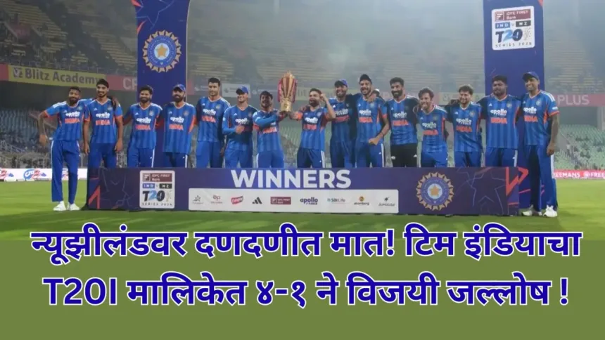 India vs New Zealand : टिम इंडियाने @IDFCFIRSTBank T20I मालिकेत दमदार खेळ दाखवत सिरीज ४-१ अशी आपल्या नावावर केली. मालिकेतील पाचव्या आणि अंतिम सामन्यात न्यूझीलंडवर ४६ धावांनी मात करत भारताने विजयाची मोहोर उमटवली आणि मालिका ४-१ ने संपवली. या सामन्यात प्रथम फलंदाजी करत भारताने २७१/५ अशी भक्कम धावसंख्या उभी केली, जी त्यांच्या T20 आंतरराष्ट्रीय इतिहासातील उच्च धावसंख्यांपैकी एक ठरली. ईशान किशनने १०३ धावांचे तुफानी शतक झळकावले (त्याचे तिसरे T20I शतक), तर कर्णधार सूर्यकुमार यादवने ६३ धावांची उपयुक्त खेळी करून डावाला वेग दिला. हार्दिक पांड्याने ४२ धावा जोडत संघाच्या धावसंख्येला आणखी बळकटी दिली. गोलंदाजीत अर्शदीप सिंगने ५ विकेट्स घेत सामन्याचे पारडे भारताच्या बाजूने झुकवले. २० षटकांत न्यूझीलंडला लक्ष्याचा पाठलाग करता आला नाही आणि त्यांची धावसंख्या २२५ वरच थांबली.ही मालिका जिंकणे भारतासाठी केवळ विजय नव्हे, तर आगामी T20 विश्वचषकासाठी आत्मविश्वास वाढवणारी तयारी ठरली. संघाने एकजूट, कौशल्य आणि नियोजनबद्ध खेळ दाखवत मोठ्या स्पर्धांसाठी आपली सज्जता सिद्ध केली. एकूणच, ४-१ ने मिळवलेला हा विजय टिम इंडियाच्या सर्वांगीण क्षमतेची ठळक साक्ष देणारा ठरला.