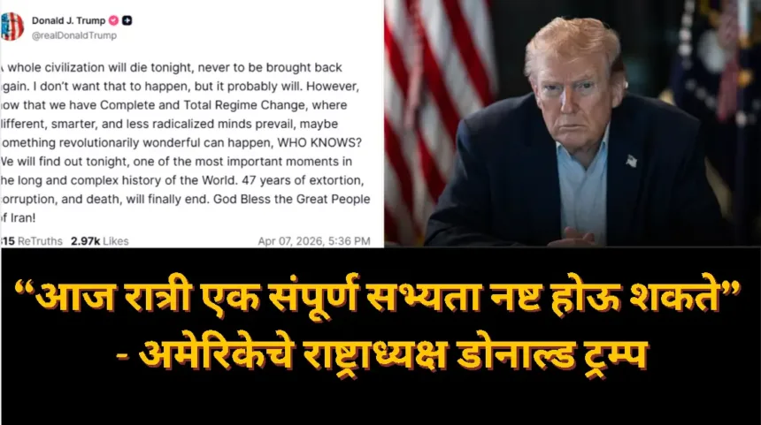 Iran War Update – अमेरिकेचे राष्ट्राध्यक्ष Donald Trump यांनी सोशल मीडिया प्लॅटफॉर्म Truth Social वर केलेल्या एका वादग्रस्त पोस्टमुळे आंतरराष्ट्रीय राजकारणात मोठी खळबळ उडाली आहे. ट्रम्प यांनी आपल्या पोस्टमध्ये इराणमधील परिस्थितीबाबत अत्यंत गंभीर आणि धोकादायक धमकी देत “आज रात्री एक संपूर्ण सभ्यता नष्ट होऊ शकते” असे म्हटले आहे.अमेरिकेचे राष्ट्राध्यक्ष डोनाल्ड ट्रम्प यांनी ७ एप्रिल २०२६ रोजी ट्रुथ सोशलवर ही पोस्ट टाकली, जी २०२६ इराण युद्धातील वाढत्या तणावाच्या पार्श्वभूमीवर आहे आणि इराणच्या पायाभूत सुविधांवर मोठ्या हल्ल्यांसाठी मुदत दिली आहे. ही पोस्ट इराणच्या “संपूर्ण सभ्यतेस” विनाशाची भीती दाखवते, जर आज रात्री (७ एप्रिलला संध्याकाळी ८ वाजेपर्यंत) कोणताही करार झाला नाही तर. मात्र, १९७९ पासूनच्या इस्लामिक रिपब्लिकच्या ४७ वर्षांच्या शासनानंतर सकारात्मक राजकीय बदलाची आशा व्यक्त केली आहे. ती “पूर्ण आणि एकूण शासनबदल” चा उल्लेख करते, ज्यात “स्मार्ट, कमी कट्टरवादी” मनं सत्तेत येतील, आणि इराणच्या लोकांना आशीर्वाद.