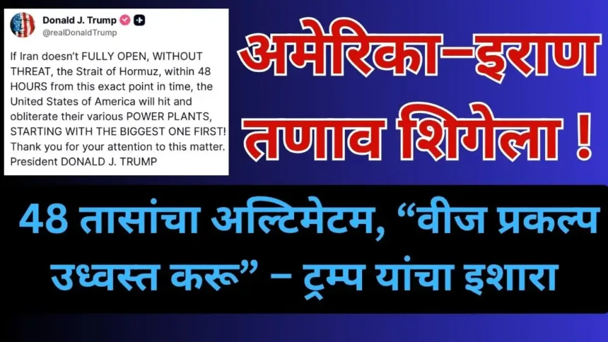 ट्रम्प यांनी स्पष्टपणे म्हटले आहे: “इराणने 48 तासांत सामुद्रधुनी पूर्णपणे खुली केली नाही, तर अमेरिका त्यांच्या मोठ्या वीज प्रकल्पांपासून हल्ले सुरू करेल.” हा इशारा फक्त लष्करी नव्हे तर ऊर्जा पायाभूत सुविधांवर थेट हल्ल्याची धमकी** मानला जात आहे, ज्यामुळे युद्ध अधिक व्यापक होण्याची शक्यता आहे.