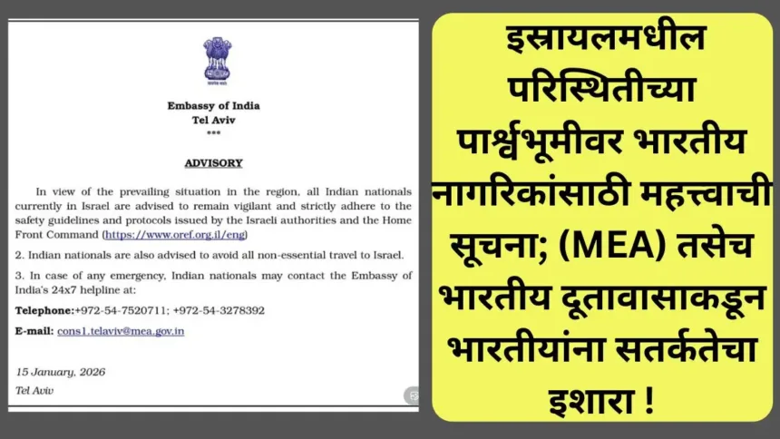 (Israel) इस्रायल आणि आसपासच्या प्रदेशातील सध्याची तणावपूर्ण व अस्थिर परिस्थिती लक्षात घेता, इस्रायलमधील भारतीय दूतावासाने तेथील भारतीय नागरिकांसाठी एक महत्त्वाची अॅडव्हायझरी (सूचना) जारी केली आहे. परराष्ट्र मंत्रालयाच्या (MEA) वतीने ही सूचना जाहीर करण्यात आली असून, इस्रायलमध्ये वास्तव्यास असलेल्या तसेच तेथे जाण्याचा विचार करणाऱ्या सर्व भारतीय नागरिकांनी विशेष दक्षता बाळगण्याचे आवाहन करण्यात आले आहे. भारतीय दूतावासाने इज़रायलमधील सर्व भारतीय नागरिकांना प्रादेशिक परिस्थितीच्या पार्श्वभूमीवर सतर्क राहण्याचा आणि स्थानिक सुरक्षितता मार्गदर्शक तत्त्वांचे काटेकोरपणे पालन करण्याचा इशारा दिला आहे. या आव्हानात्मक काळात भारतीयांच्या सुरक्षिततेसाठी हे एक महत्त्वपूर्ण पाऊल आहे. दूतावासाने स्पष्टपणे नमूद केले आहे की, सध्या इस्रायलमध्ये असलेल्या सर्व भारतीय नागरिकांनी अत्यंत सतर्क राहावे आणि इस्रायली प्रशासन व होम फ्रंट कमांडकडून वेळोवेळी जारी करण्यात येणाऱ्या सुरक्षा मार्गदर्शक सूचना व नियमांचे काटेकोरपणे पालन करावे.