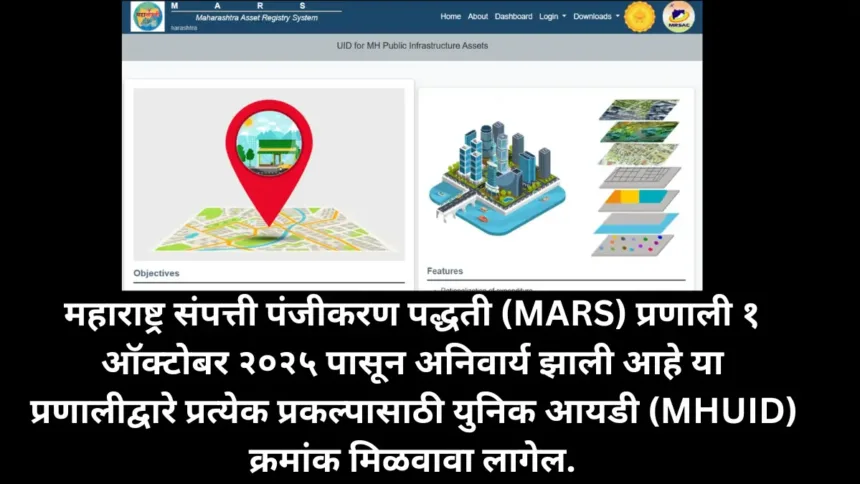 MARS – महाराष्ट्र सरकारने राज्यातील सर्व शासकीय, निमशासकीय कार्यालये, जिल्हा परिषदा, महानगरपालिका आणि अन्य यंत्रणांसाठी पायाभूत विकास प्रकल्पांसाठी महाराष्ट्र संपत्ती पंजीकरण पद्धती (महासंपत्ती – MARS) प्रणाली १ ऑक्टोबर २०२५ पासून अनिवार्य केली आहे. या प्रणालीद्वारे प्रत्येक प्रकल्पासाठी युनिक आयडी (MHUID) क्रमांक https://mhuid.mrsac.org.in या पोर्टलवरून मिळवावा लागेल, ज्यामुळे विकास कामांचे नियोजन, सुसूत्रता आणि समतोल विकास साध्य होईल. MARS प्रणाली प्रशासकीय कामाशी संबंधित असली तरीही जनतेच्या करातून होणाऱ्या कामांमध्ये पारदर्शकतेसह पायाभूत सुविधा कुठे, कधी आणि कितपत पूर्ण झाल्या याची माहिती या प्रणालीद्वारे सहज उपलब्ध होईल.