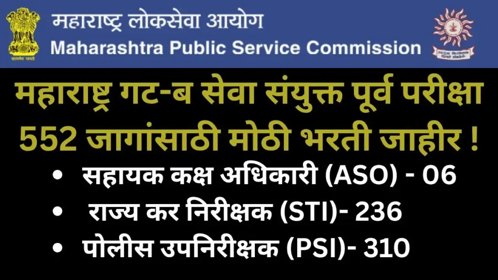 MPSC Group B Bharti 2026 : महाराष्ट्रातील सरकारी नोकरीची तयारी करणाऱ्या तरुणांसाठी मोठी संधी उपलब्ध झाली आहे. Maharashtra Public Service Commission (MPSC) मार्फत “महाराष्ट्र गट-ब (अराजपत्रित) सेवा संयुक्त पूर्व परीक्षा 2026” साठी भरती जाहीर करण्यात आली आहे. या भरतीद्वारे एकूण 552 पदे भरण्यात येणार असून इच्छुक उमेदवारांसाठी ही एक सुवर्णसंधी मानली जात आहे.
