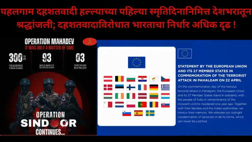 Pahalgam दहशतवादी हल्ल्याच्या पहिल्या स्मृतिदिनानिमित्त युरोपियन युनियन तसेच अमेरिकेने भारतासोबत एकजूट दर्शवत दहशतवादाविरोधातील लढ्यात पाठिंबा व्यक्त केला