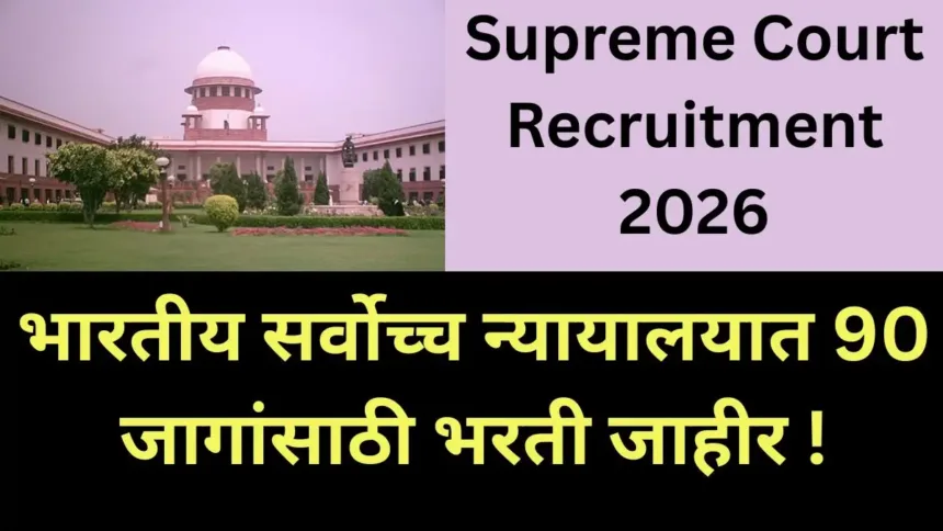Supreme Court Recruitment 2026 : भारतीय न्यायव्यवस्थेतील सर्वोच्च संस्था असलेल्या भारतीय सर्वोच्च न्यायालयात (Supreme Court of India) तब्बल 90 पदांसाठी भरती प्रक्रिया जाहीर करण्यात आली आहे. ही भरती लॉ क्लर्क-कम-रिसर्च असोसिएट्स पदांसाठी होणार असून, विधी शिक्षण पूर्ण केलेल्या उमेदवारांसाठी ही एक अत्यंत सुवर्णसंधी मानली जात आहे. भारतीय सर्वोच्च न्यायालय हे देशाचे सर्वोच्च अपील न्यायालय असून फौजदारी, दिवाणी तसेच घटनात्मक प्रकरणांमध्ये अंतिम निर्णय देण्याचा अधिकार याच न्यायालयाकडे आहे. या न्यायालयामध्ये मुख्य न्यायाधीश (Chief Justice of India) व 33 इतर न्यायाधीश कार्यरत असतात.
