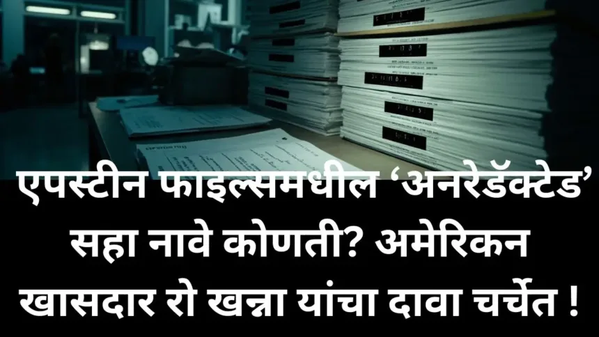 अमेरिकेतील भारतीय वंशाच्या डेमोक्रॅट खासदार रो खन्ना यांनी सोमवारी दावा केला की, जेफ्री एपस्टाईन फाइल्समध्ये समाविष्ट सहा नावे “संभाव्यतः दोषसिद्ध करणारी” असूनही ती “अनुचितपणे” लपवली गेली आहेत. डिसेंबरपासून EFTA अंतर्गत सोडवलेल्या अंदाजे तीन दशलक्ष पानांच्या फाइल्सच्या अप्रकाशित आवृत्तीची तपासणी काँग्रेस सदस्यांना सुरू करण्यास परवानगी देण्यात आली असल्याचे बीबीसी न्यूजने नमूद केले.