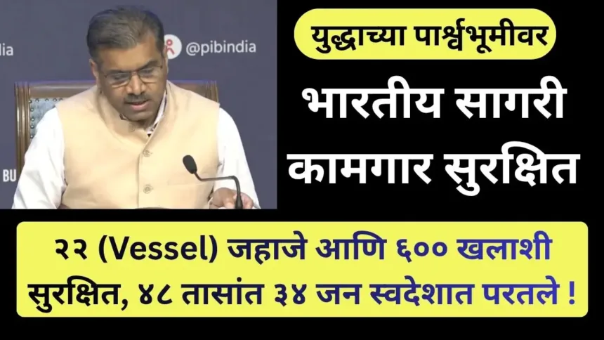 Vessel – भारताच्या सागरी क्षेत्राशी संबंधित एक दिलासादायक बातमी समोर आली आहे. केंद्रीय बंदरे, जहाजवाहतूक आणि जलमार्ग मंत्रालयाचे विशेष सचिव राजेश कुमार सिन्हा यांनी दिलेल्या माहितीनुसार, सध्या परदेशात कार्यरत असलेली भारताची २२ व्यापारी (Vessel) जहाजे आणि सुमारे ६०० भारतीय खलाशी पूर्णपणे सुरक्षित आहेत. कोणत्याही प्रकारची सागरी दुर्घटना किंवा धोका अद्याप नोंदवला गेलेला नाही. या परिस्थितीत Directorate General of Shipping (DGS) सतत सक्रिय असून, त्यांनी जहाज मालक, RPSL (Recruitment and Placement Services License) एजन्सी आणि विविध देशांतील भारतीय दूतावासांशी सातत्याने संपर्क ठेवला आहे. या समन्वयामुळे भारतीय खलाशांची सुरक्षितता सुनिश्चित करण्यात मोठी मदत होत आहे.संकटाच्या पार्श्वभूमीवर भारतीय नागरिकांना सुरक्षितपणे परत आणण्याची प्रक्रिया वेगाने सुरू आहे. गेल्या २४ तासांत १३ खलाशांची भारतात परतले आहेत. तर गेल्या ४८ तासांत एकूण ३४ खलाशी स्वदेशात परतले आहेत. ही आकडेवारी दर्शवते की सरकारने आपत्कालीन परिस्थितीत जलद आणि प्रभावी पावले उचलली आहेत.